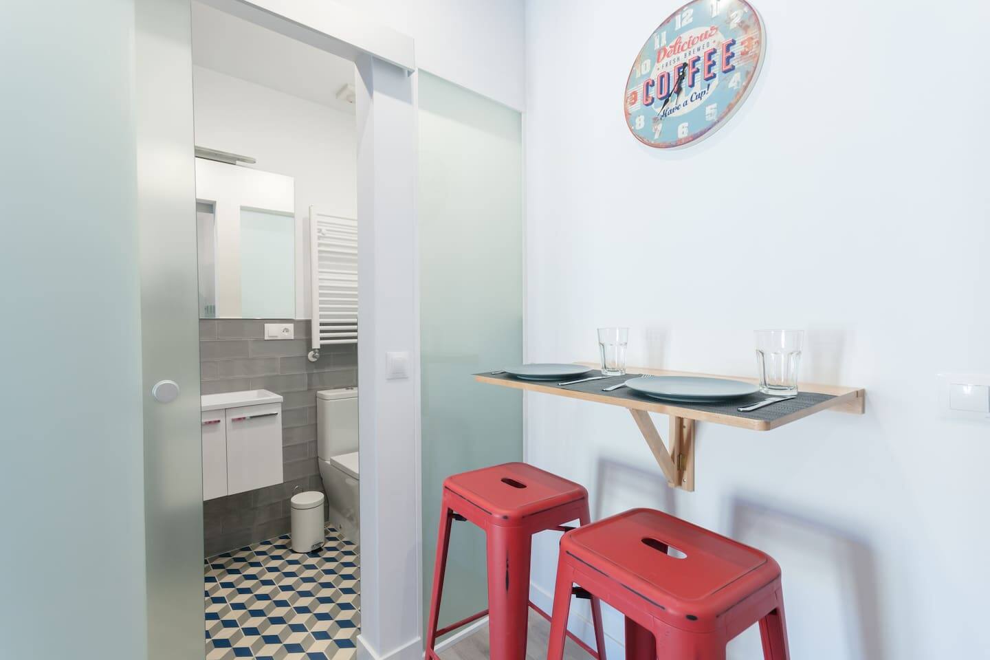 Bright and cozy at the very historical city center. Full equipped with Hi Speed Wifi, Air Conditioning, Central Heating, SmartTV, Fridge, Induction Kitchen, Hair Dryer, etc. Located at 100m from La Latina Metro Station You will be at the very city center but you will not ear any noise, the studio is Brand new, built with best quality soundproof windows. Terraces, cafeterias, theatres, museums…all inside the neighborhood! Connected by buses and 2 metro lines. Close to Plaza Mayor 300m, 5 minutes walking to Sol Square, to Kings palace, to San Miguel Market, Almudena Cathedral, also close to Prado Museum and Reina Sofia Museum. The apartment is surrounded by food markets, fruit stores, etc. La Latina is an historical neighborhood, very well known by its bohemian environment and its street life, it is also very secure. The apartment is based on a 3rd floor, keep in mind there’s not elevator yet.