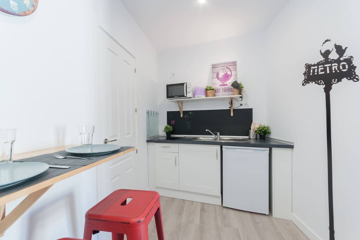 Bright and cozy at the very historical city center.Full equipped with Hi Speed Wifi, Air Conditioning, Central Heating, SmartTV, Fridge, Induction Kitchen, Hair Dryer, etc.Located at 100m from La Latina Metro StationYou will be at the very city center but you will not ear any noise, the studio is Brand new, built with best quality soundproof windows.Terraces, cafeterias, theatres, museums…all inside the neighborhood!