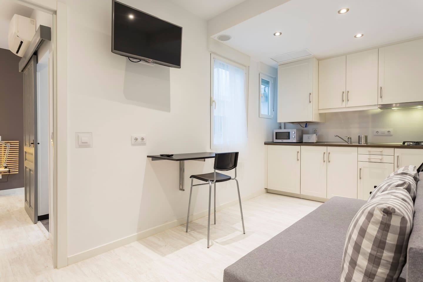 Beautifully refurbished in the heart of Madrid. Cosy and full of light in the historic centre. Includes high-speed Wi-Fi, air-conditioning, heating, fridge and hair-dryer. Right on Atocha Station square. Terraces, cafés, theatres and museums are all on your doorstep—you can walk to every corner of Madrid’s city centre, no other transport needed.