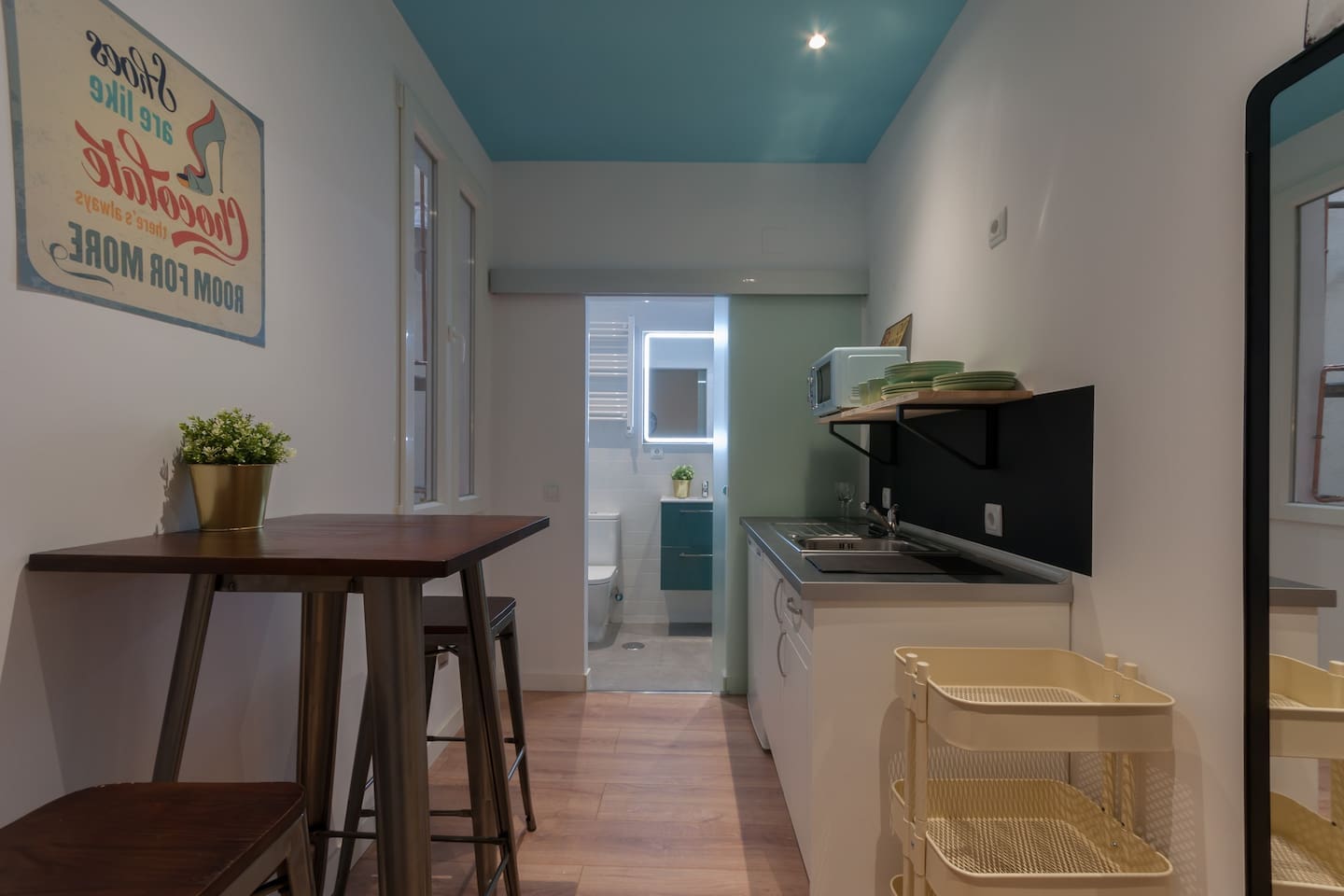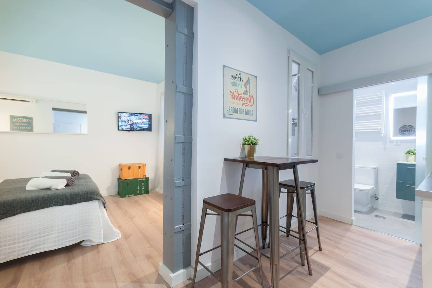 Bright and fully renewed at the very historical city center. Full equipped with Hi Speed Wifi, Air Conditioning, Central Heating, SmartTV, Fridge, Induction Kitchen, Hair Dryer, etc. Located in front of Atocha Station, Reina Sofia museum and Retiro Park You will be at the very city center but you will not ear any noise, the studio is Brand new, built with best quality soundproof windows. Terraces, cafeterias, theatres, museums…all inside the neighborhood! Connected by buses and 4 metro lines. Close to Plaza Mayor Sol Square, to Kings palace, to San Miguel Market, Almudena Cathedral, also close to Prado Musseum, Retiro Park and in front of Reina Sofia Musseum. The apartment is surrounded by food markets, fruit stores, etc. Historical neighborhood, very well known by its bohemian environment and its street life, it is also very secure. The apartment is based on a 2nd floor and the building has elevator.
