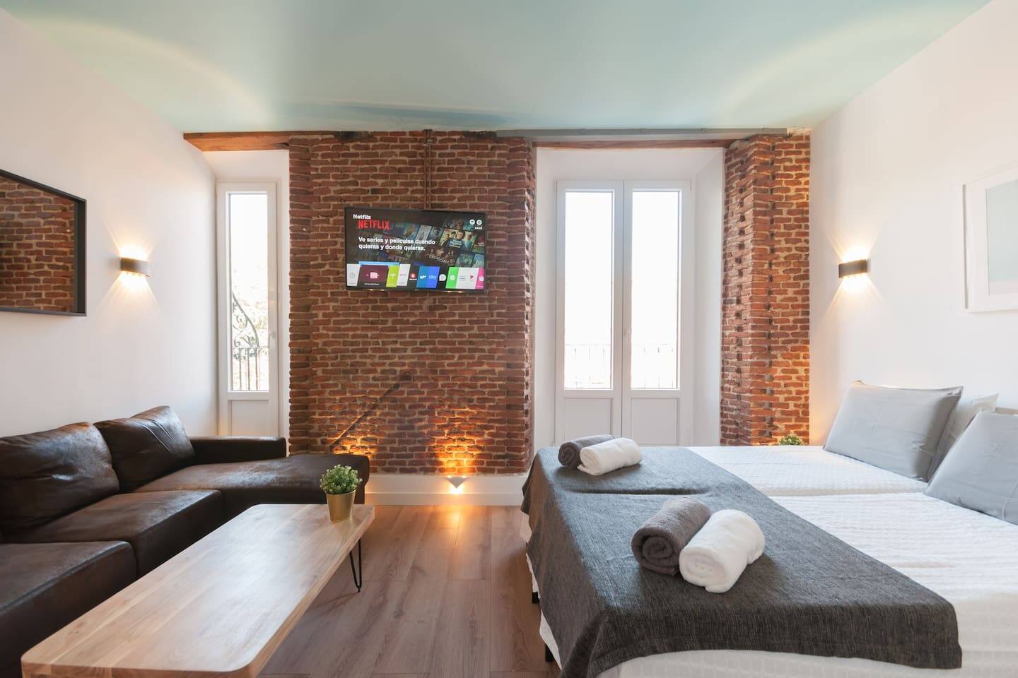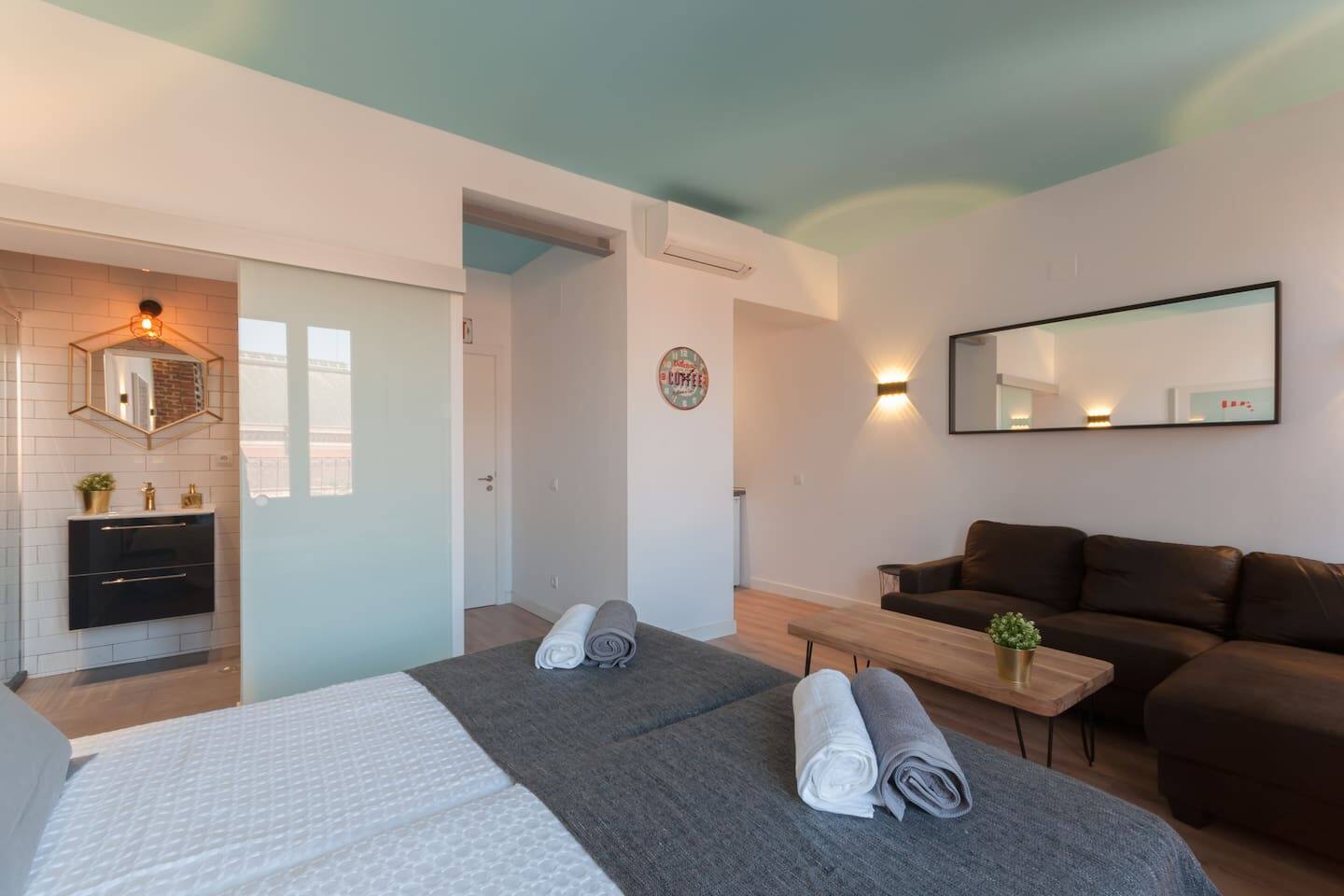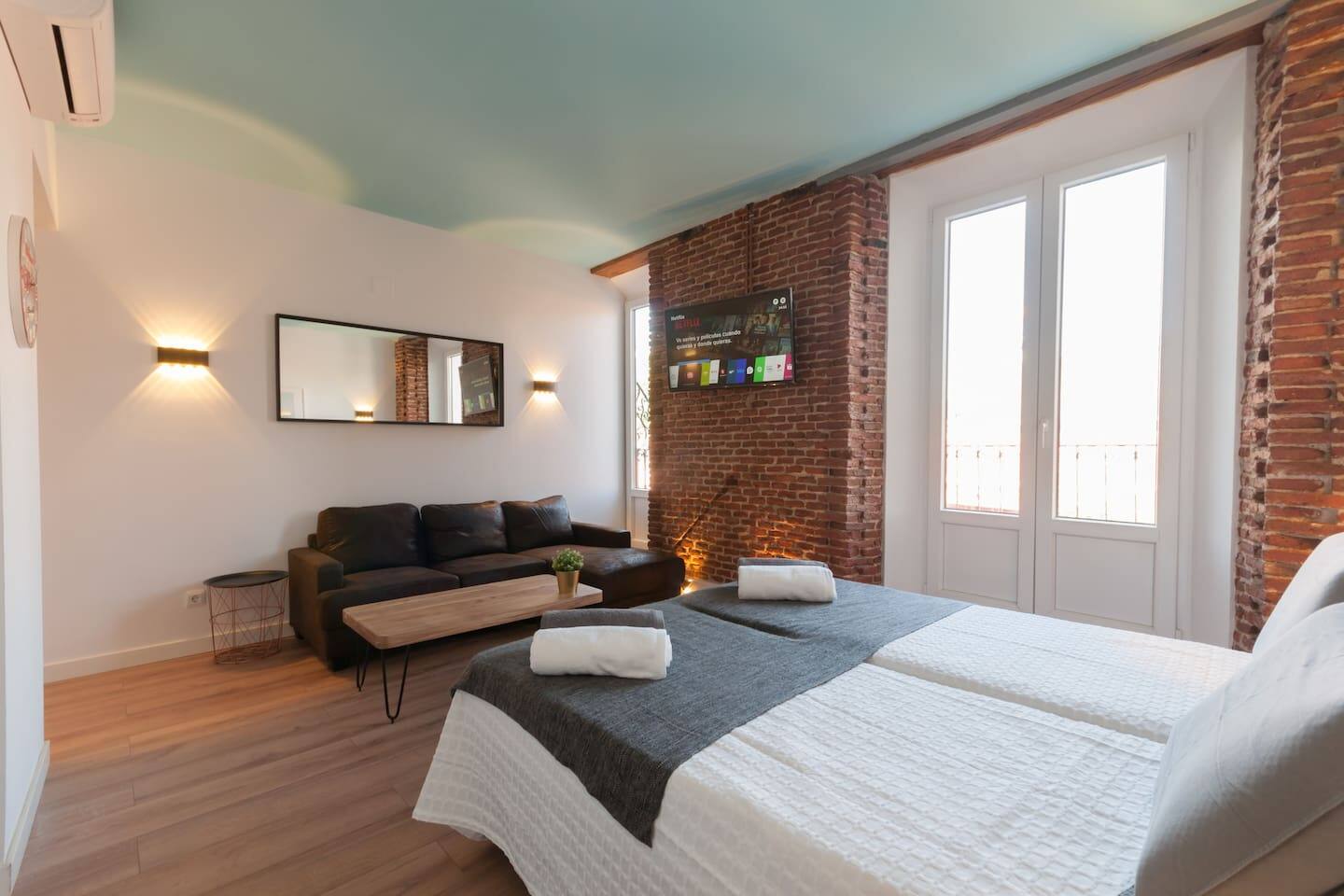Bright and fully renewed at the very historical city center.Full equipped with Hi Speed Wifi, Air Conditioning, Central Heating, SmartTV, Fridge, Induction Kitchen, Hair Dryer, etc.25m2 Located in front of Atocha Station, Reina Sofia museum and Retiro ParkYou will be at the very city center but you will not ear any noise, the studio is Brand new, built with best quality soundproof windows.Terraces, cafeterias, theatres, museums…all inside the neighborhood!