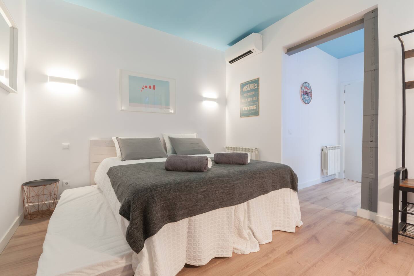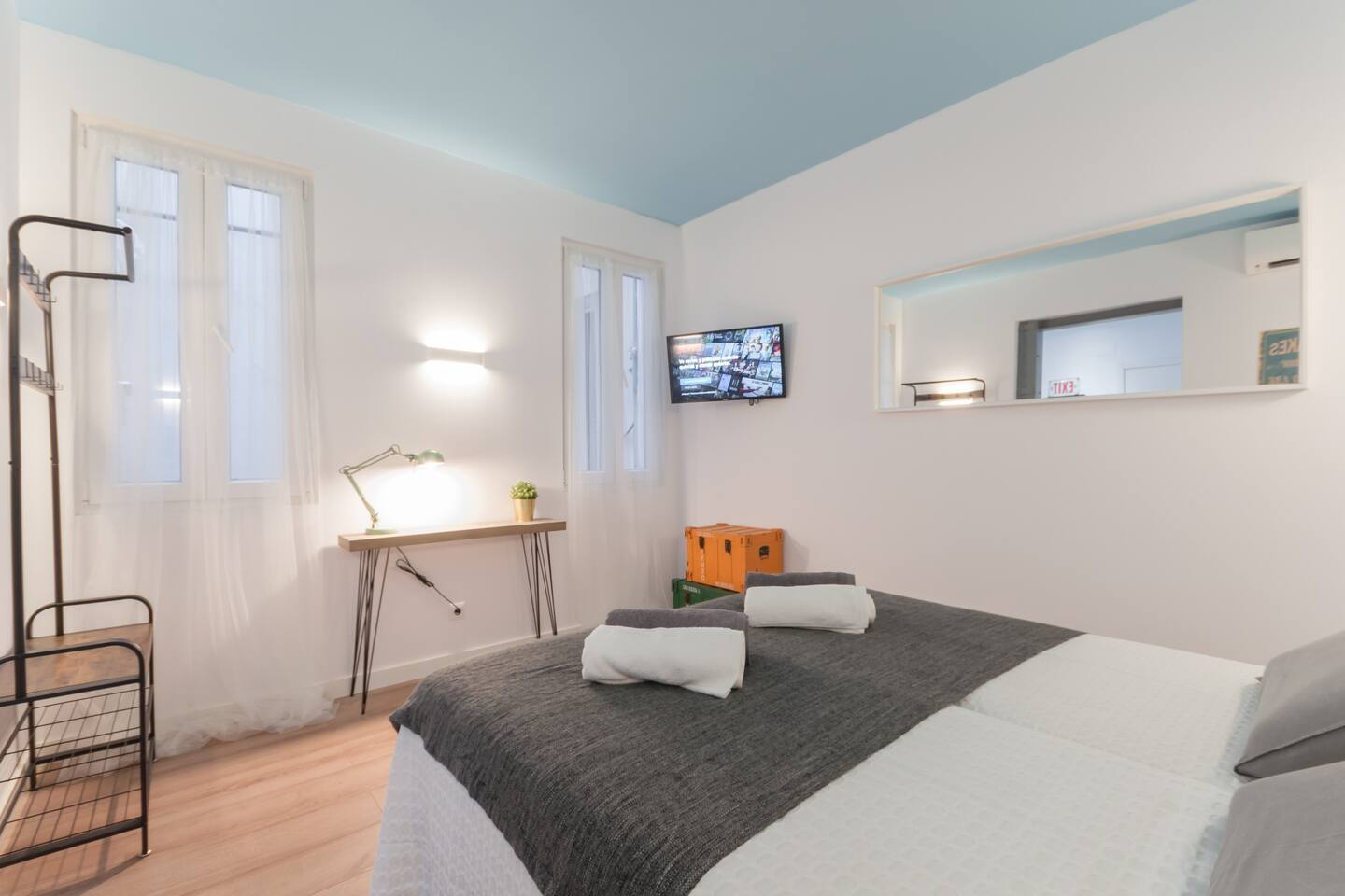 Brand new, we have equipped I it with very good quality sound proof windows, new super comfortable beds, SmartTV, A/C, central heating, good shower…everything to make you feel at home