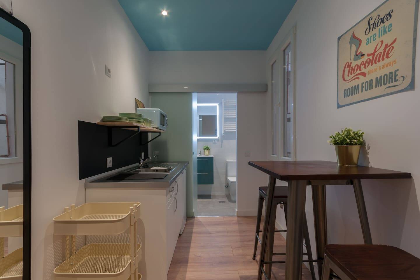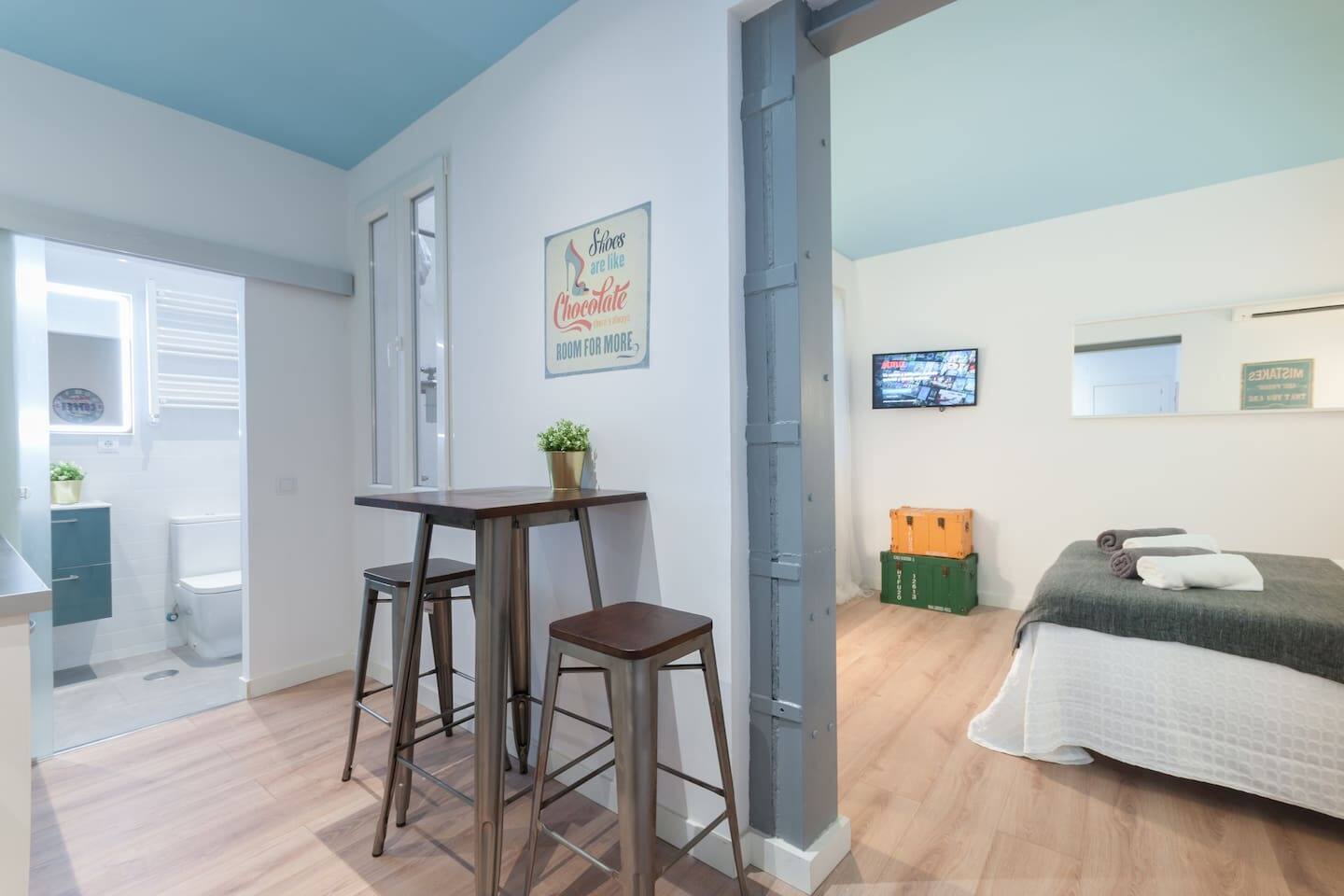 Bright and fully renewed at the very historical city center. Full equipped with Hi Speed Wifi, Air Conditioning, Central Heating, SmartTV, Fridge, Induction Kitchen, Hair Dryer, etc. Located in front of Atocha Station, Reina Sofia museum and Retiro Park You will be at the very city center but you will not ear any noise, the studio is Brand new, built with best quality soundproof windows. Terraces, cafeterias, theatres, museums…all inside the neighborhood! Connected by buses and 4 metro lines. Close to Plaza Mayor Sol Square, to Kings palace, to San Miguel Market, Almudena Cathedral, also close to Prado Musseum, Retiro Park and in front of Reina Sofia Musseum. The apartment is surrounded by food markets, fruit stores, etc. Historical neighborhood, very well known by its bohemian environment and its street life, it is also very secure. The apartment is based on a 2nd floor and the building has elevator.