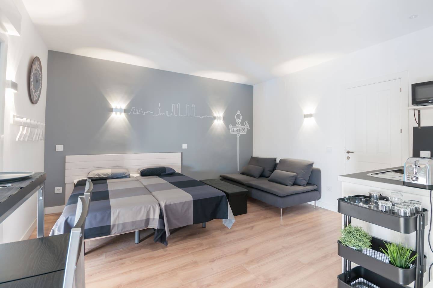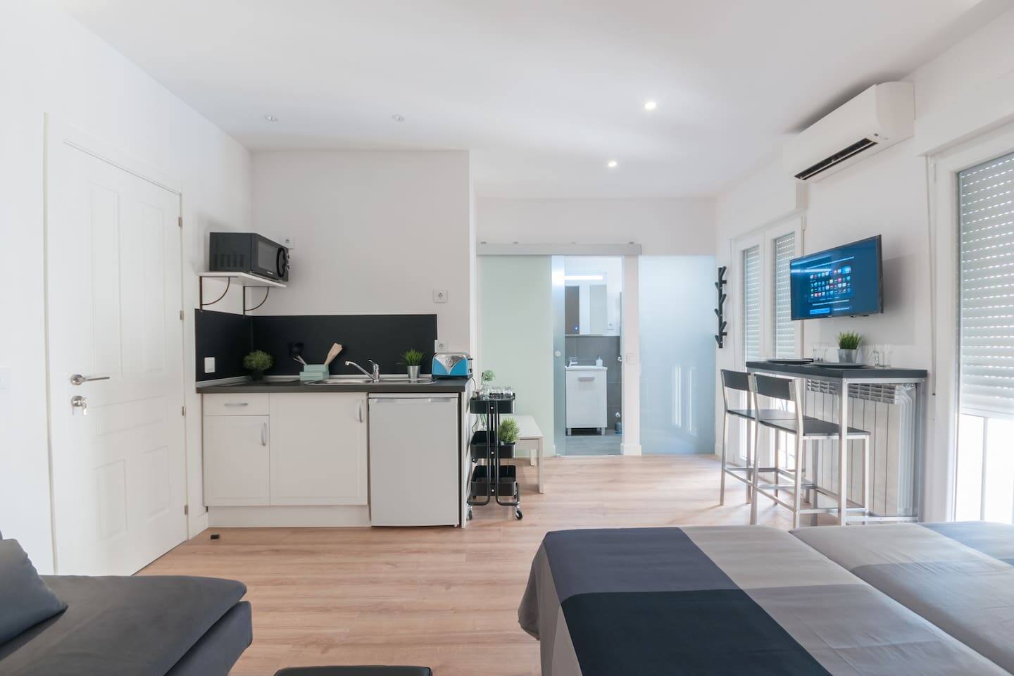 Bright and cozy at the very historical city center.Full equipped with Hi Speed Wifi, Air Conditioning, Central Heating, SmartTV, Fridge, Induction Kitchen, Hair Dryer, etc.Located at Atocha Station Square, in front of Reina Sofia musseum. You will be at the very city center but you will not ear any noise, the studio is Brand new, built with best quality soundproof windows.Terraces, cafeterias, theatres, museums all inside the neighborhood!